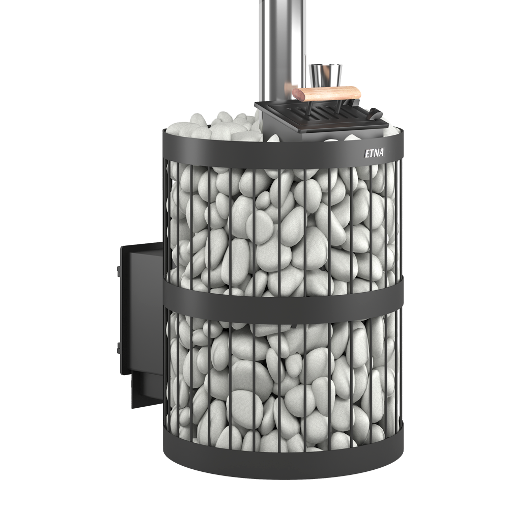 Чугунная банная печь ЭТНА 18 (ДТ-4С ) Закрытая каменка рассчитана на работу в парной объёмом до 18 м3. Цельно литая чугунная дверца сохраняет свою форму при нагревании. Крепление дверок к топочному тоннелю – болтовое, позволяет снимать и заменять дверку. Сетка для камней сделана в виде корзины из стального прутка диаметром 6 миллиметров. Три кольца из стальной полосы толщиной 2 миллиметра придают сетке дополнительную прочность и улучшают внешний вид. Сетка изготовлена из конструкционной стали. По всей высоте в сетку укладываются камни для бани. Заклад обеспечивает работу открытой каменки, а также равномерно распределяет тепло в пространстве парной, а так же защищают парящихся от жёсткого инфракрасного излучения. Кожух диаметром 560 миллиметров вмещает в себя до 120 килограммов камней крупной и средней фракции.