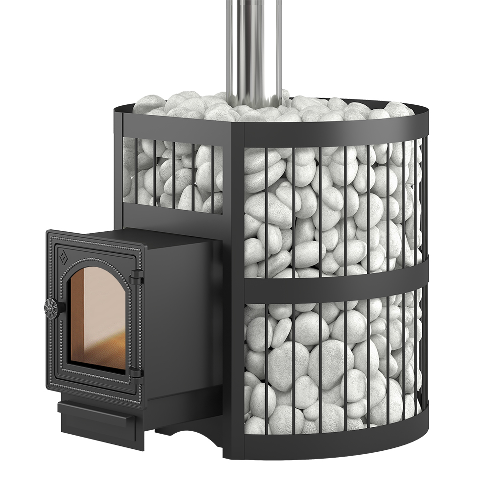 Чугунная банная печь ЭТНА 24 (ДТ-4С) рассчитана на работу в парной объёмом до 24 м3. Цельно литая чугунная дверца сохраняет свою форму при нагревании. Крепление дверок к топочному тоннелю – болтовое, позволяет снимать и заменять дверку. Сетка для камней сделана в виде корзины из стального прутка диаметром 6 миллиметров. Три кольца из стальной полосы толщиной 2 миллиметра придают сетке дополнительную прочность и улучшают внешний вид. Сетка изготовлена из конструкционной стали. По всей высоте в сетку укладываются камни для бани. Заклад обеспечивает работу открытой каменки, а также равномерно распределяет тепло в пространстве парной, а так же защищают парящихся от жёсткого инфракрасного излучения. Кожух диаметром 560 миллиметров вмещает в себя до 120 килограммов камней крупной и средней фракции.