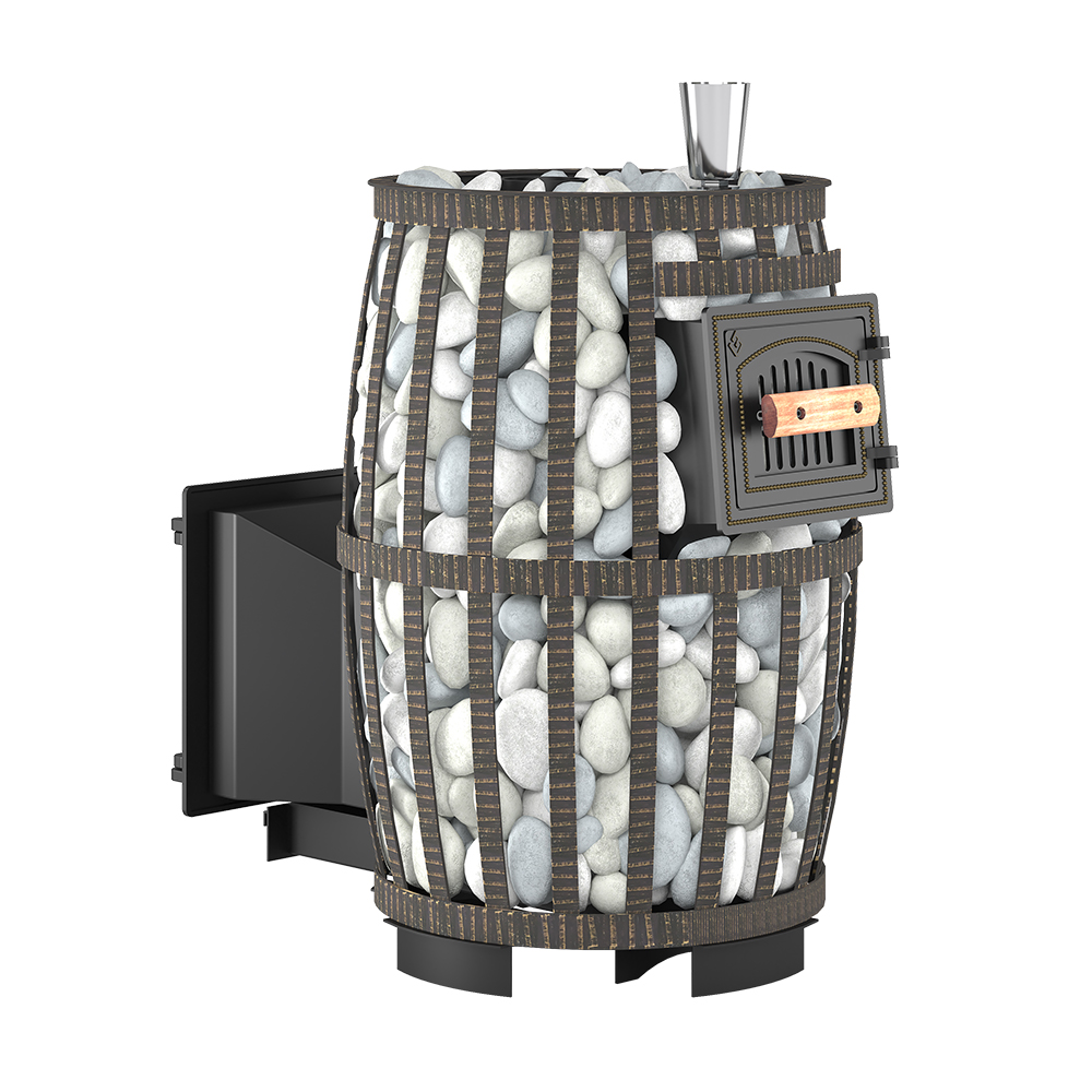 Печь для бани Везувий Легенда Русский пар Ковка 24 (505) имеет сетчатый кожух-конвектор, выполненный из металлической текстурированной полосы, покрашенной термостойкой краской и покрытой патиной Бронза. Закладка камнем в таком кожухе позволяет в разы уменьшить излучение, получаемое от металла печи, при этом камень прекрасно аккумулирует тепло и сохраняет его на протяжении длительного времени. Конструкция печи Везувий рассчитана на установку в парильном помещении с выходом топки в смежное помещение. Панорамная дверка шириной стекла 345 мм позволит наблюдать за огнем из комнаты отдыха.