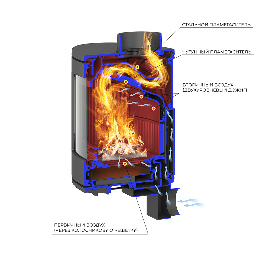 Топка печи-камина усилена чугунными вставками с системой двухуровневого вторичного дожига. С помощью этой функции по каналам подачи вторичного воздуха поступает воздух, который нагревается при прохождении между топочной камерой и стенками корпуса. Далее нагретый воздух через дефлектор поступает в топку, перемешивается с газами - продуктами горения, чем вызывает повторное возгорание. Регулировка этой системы, как и подача воздуха в колосниковую зону, осуществляется рычагом, расположенным слева в нижней части печи-камина.