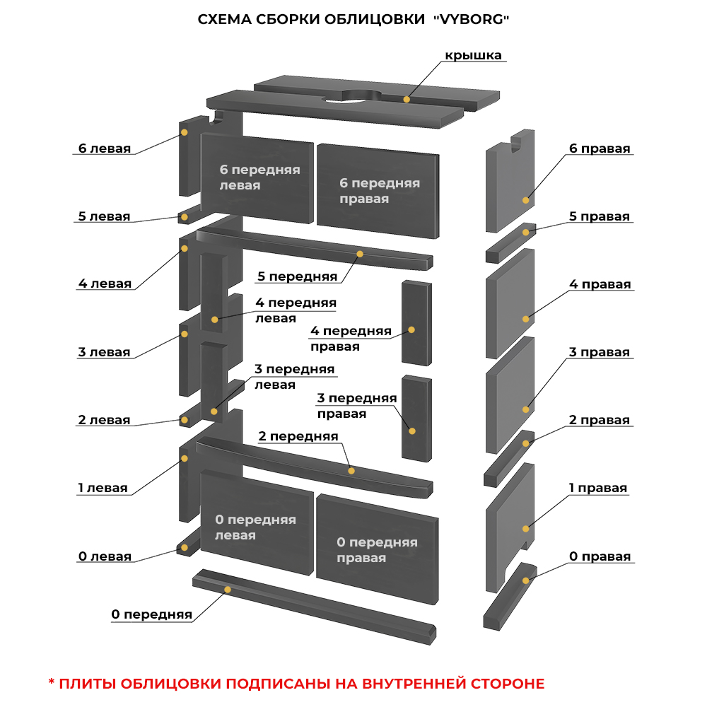 Облицовка собирается по месту, каменные плиты скрепляются между собой с помощью алюминиевых направляющих. Сборка и установка облицовки проходит без грязи и занимает не более часа времени. На верхней крышке размещено отверстие для дымохода. Для простоты монтажа крышка сделана составной, из двух частей. На крышку может устанавливаться приобретаемая отдельно облицовка дымохода, тоже сделанная из натурального камня. .