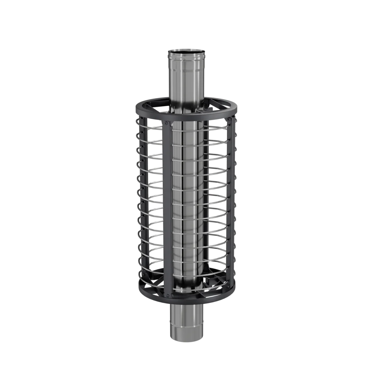 Сетка-каменка защищает от излучения, уменьшая поверхность открытой трубы, снимает тепло с ее стенок и направляет его на прогрев камней.