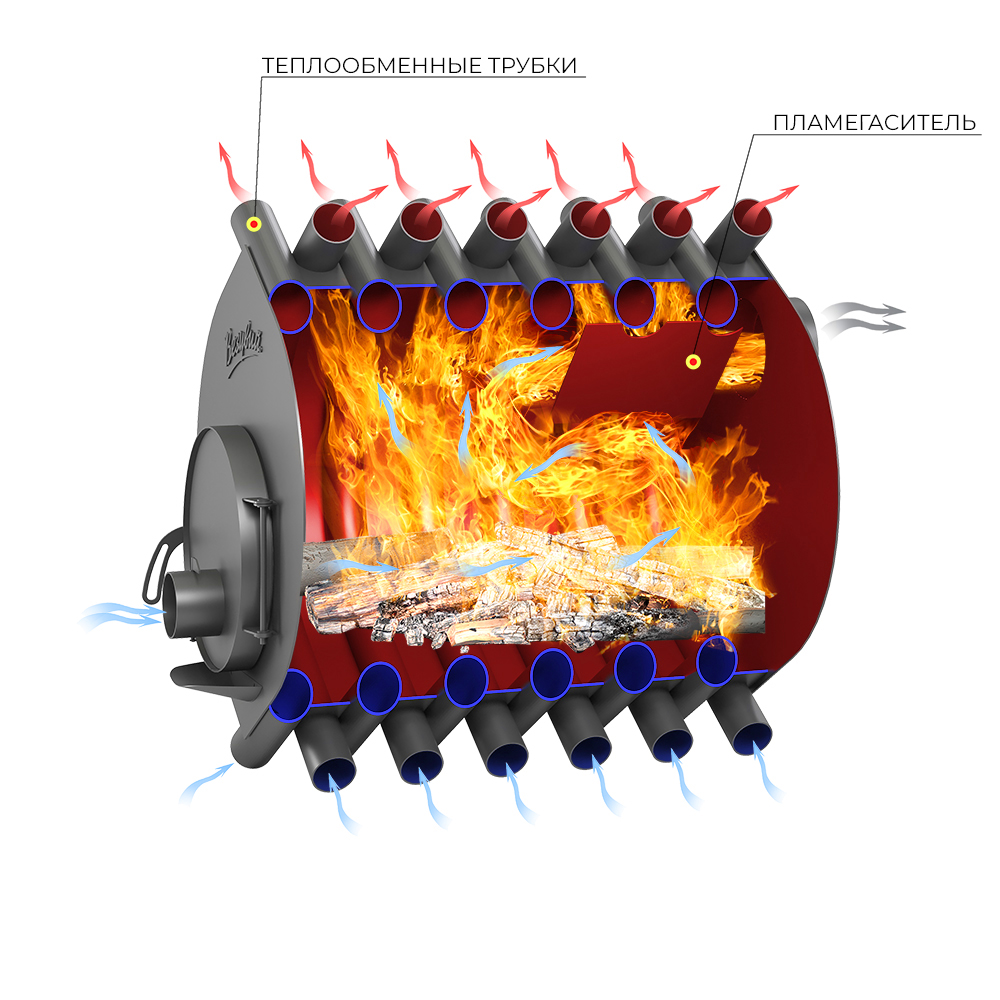 АОГТ представляет собой тепловой агрегат конвекционного типа с КПД 75-80% и системой длительного горения топлива. Сварная конструкция из особо прочной котловой стали 09Г2С и рассчитана на долговременную эксплуатацию. Две камеры сгорания, нижняя камера газификации и верхняя камера дожига газов, обеспечивают практически полное сгорание топлива и получение максимального количества энергии во время работы печи.