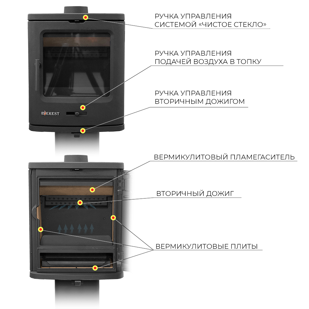 В верхней части расположена ручка регулировки системы чистое стекло, которая помогает оставаться стеклу чистым отсекая сажу и копоть воздухом, подаваемым с верхней части топки.