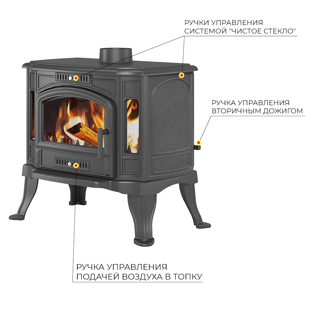 Вторичный дожиг в печи-камине обеспечивается двойной задней стенкой: здесь между стенкой и внутренней облицовкой топки из чугуна есть канал, идущий из поддувала под нижний край пламегасителя, в зону активного горения. Воздух для вторичного дожига поступает в верхнюю часть топки, усиливая горение и повышая теплоотдачу. Вторичный дожиг регулируется заслонкой, расположенной на задней стенке печи-камина. Ручка управления заслонкой находится справа.
