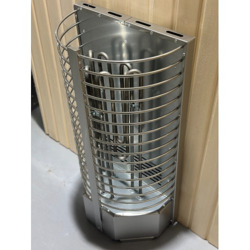Электрокаменка выполнена из качественной нержавеющей стали и представляет собой полукруг с радиусными прутьями, вмещающий 60 кг камня.