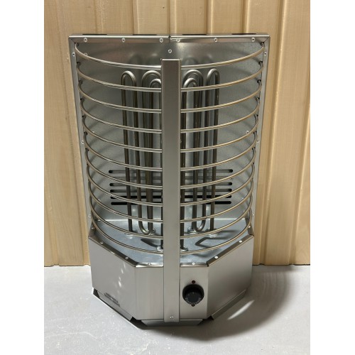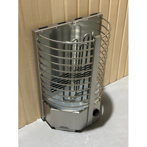 Электрокаменка выполнена из качественной нержавеющей стали и представляет собой полукруг с радиусными прутьями, вмещающий 60 кг камня.