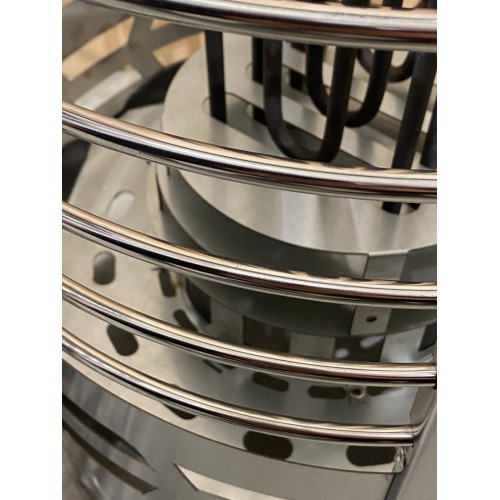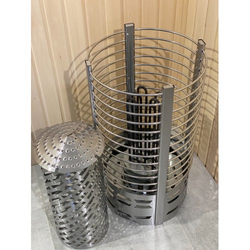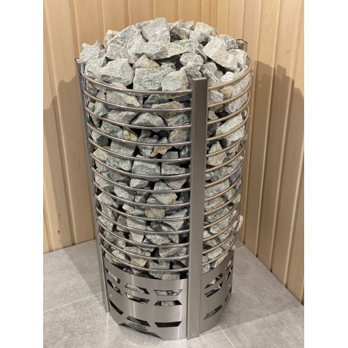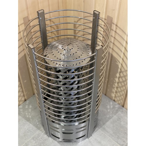 Электрокаменка выполнена из качественной нержавеющей стали (марка стали 304 и 430 комбинированно) и представляет собой широкий цилиндр с радиусными прутьями , вмещающий 125 кг камня.