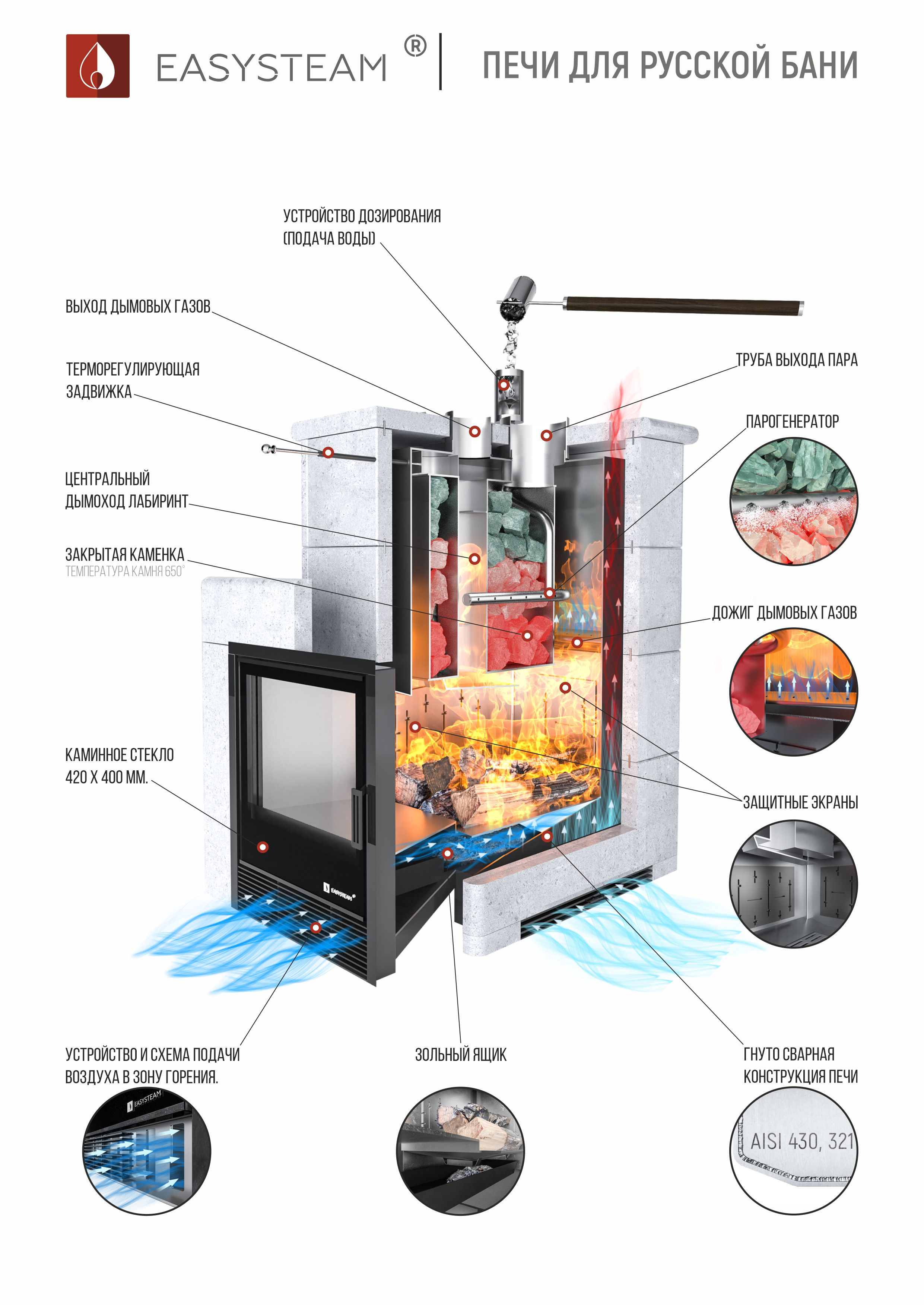 Печи ИзиСтим выполнены из жаропрочной нержавеющей стали AISI 430 4-6мм, обладают высокопрочной особо усиленной конструкцией печи и уникальным парогенератором для получения качественного мелкодисперсного легкого пара. Топочное пространство в печах дополнительно усилено жаропрочными защитными экранами из нержавеющей стали толщиной 4 мм. Все модели печей ИзиСтим можно изготовить на любой вкус: с закрытым или открытым верхом, боковым подключением, в трехстороннем или полноценном кожухе. Также во всех моделях печей для русской бани используются 3 вида камня для облицовки: талькохлорит, змеевик, пироксенит.