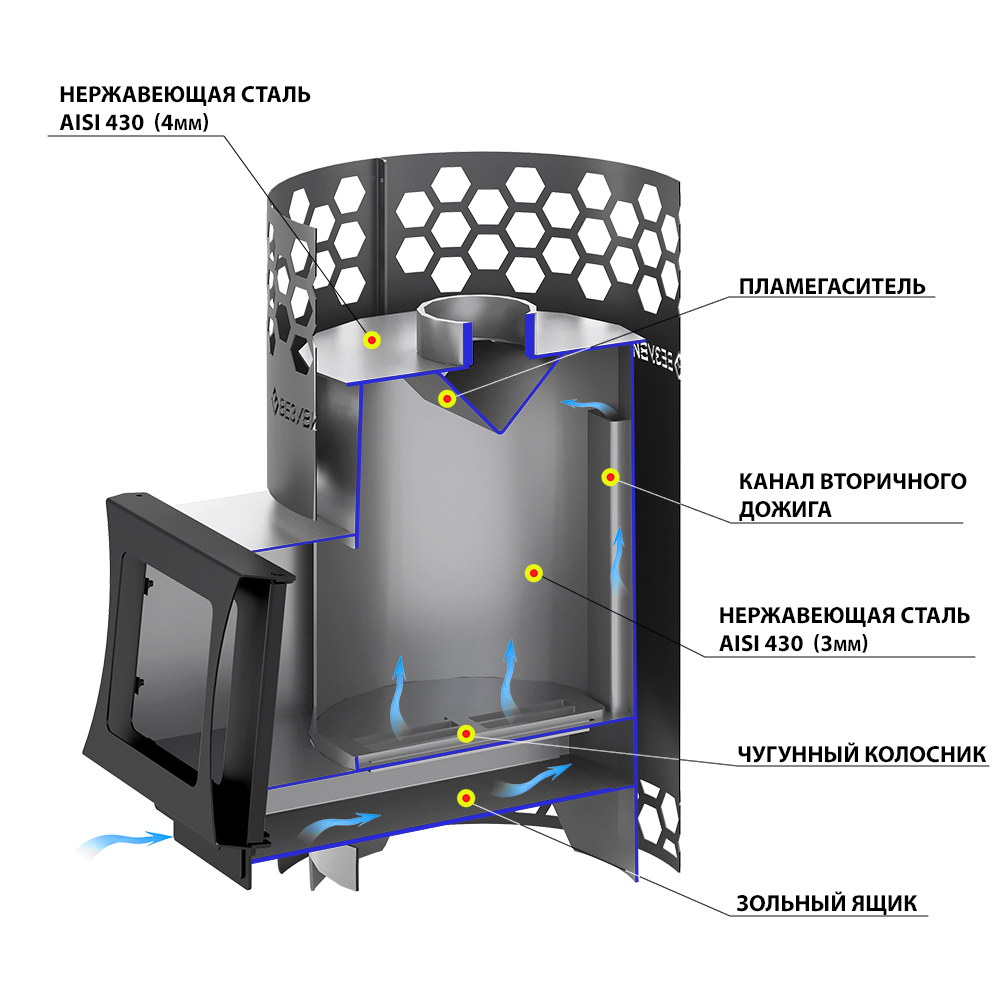 Договор заключается в момент оплаты Покупателем товара ТОЛЬКО в ОФЛАЙН-МАГАЗИНЕ. Делая предварительный заказ, Покупатель заверяет, что ознакомился и согласен с Политикой компании, она ему ясна и понятна.Печь для бани Везувий "Чёрная Пчёлка С" Нержавеющая сталь (Inox) со стеклом