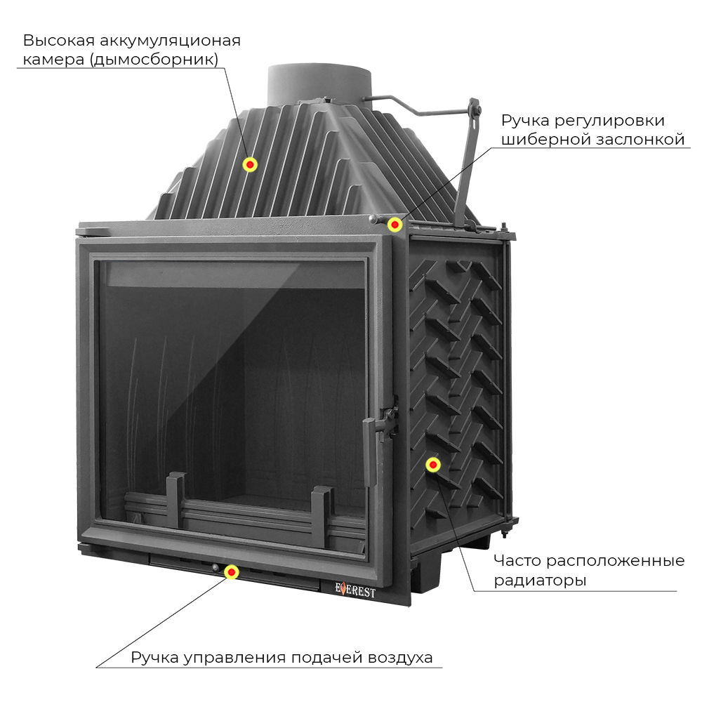 Каминная топка ЭВЕРЕСТ (EVEREST) A16 изготовлена из качественного жаростойкого чугуна (ГОСТ 1412-85) с толщиной стенок 6-10 мм