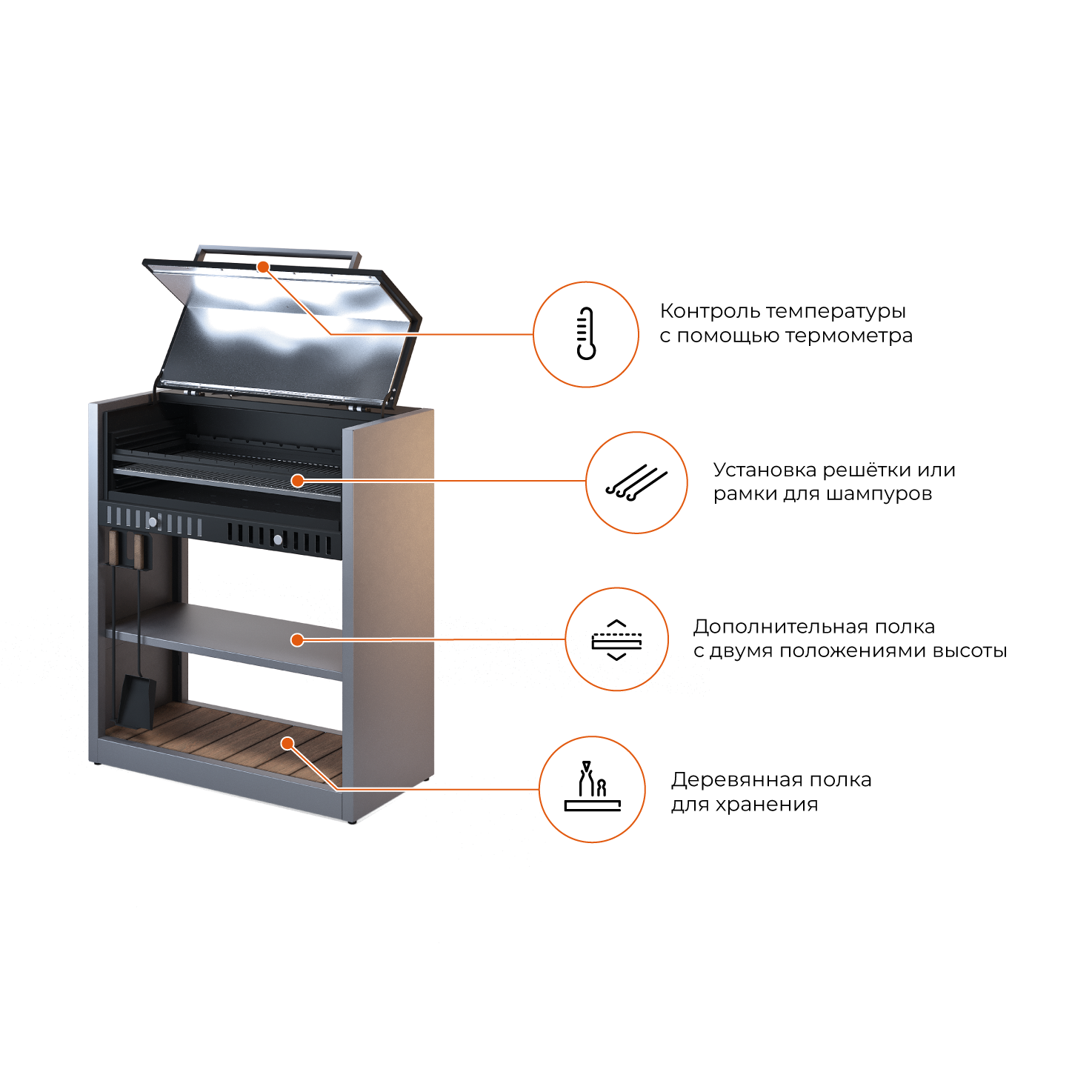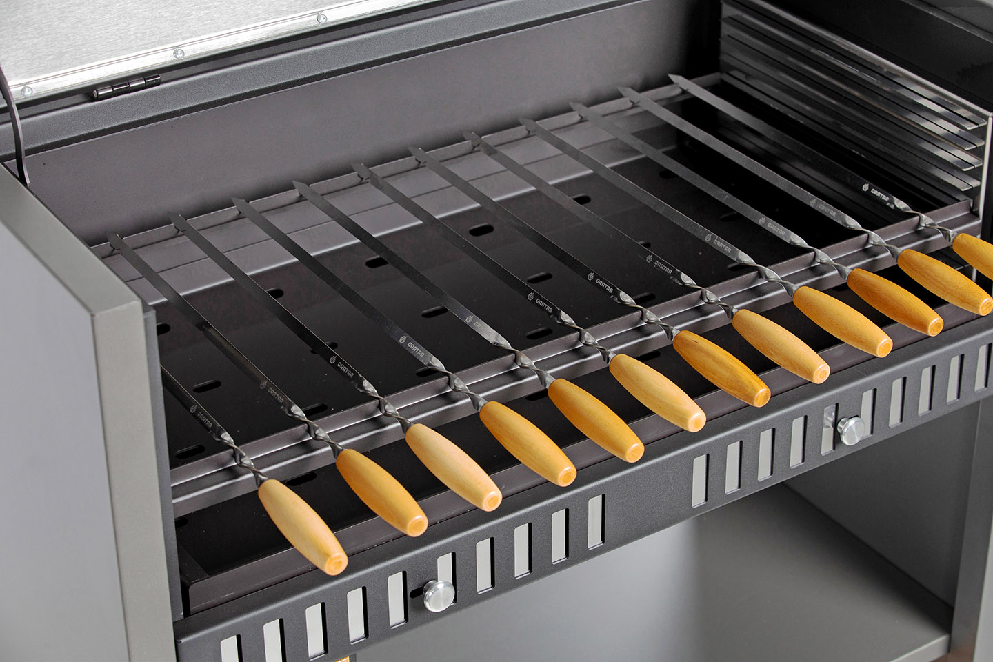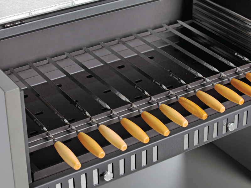 Рамка для шампуров выставляется на один из 8 уровней высоты и рассчитана на 12 шампуров. *Шампура в комплект не входят, приобретаются отдельно.